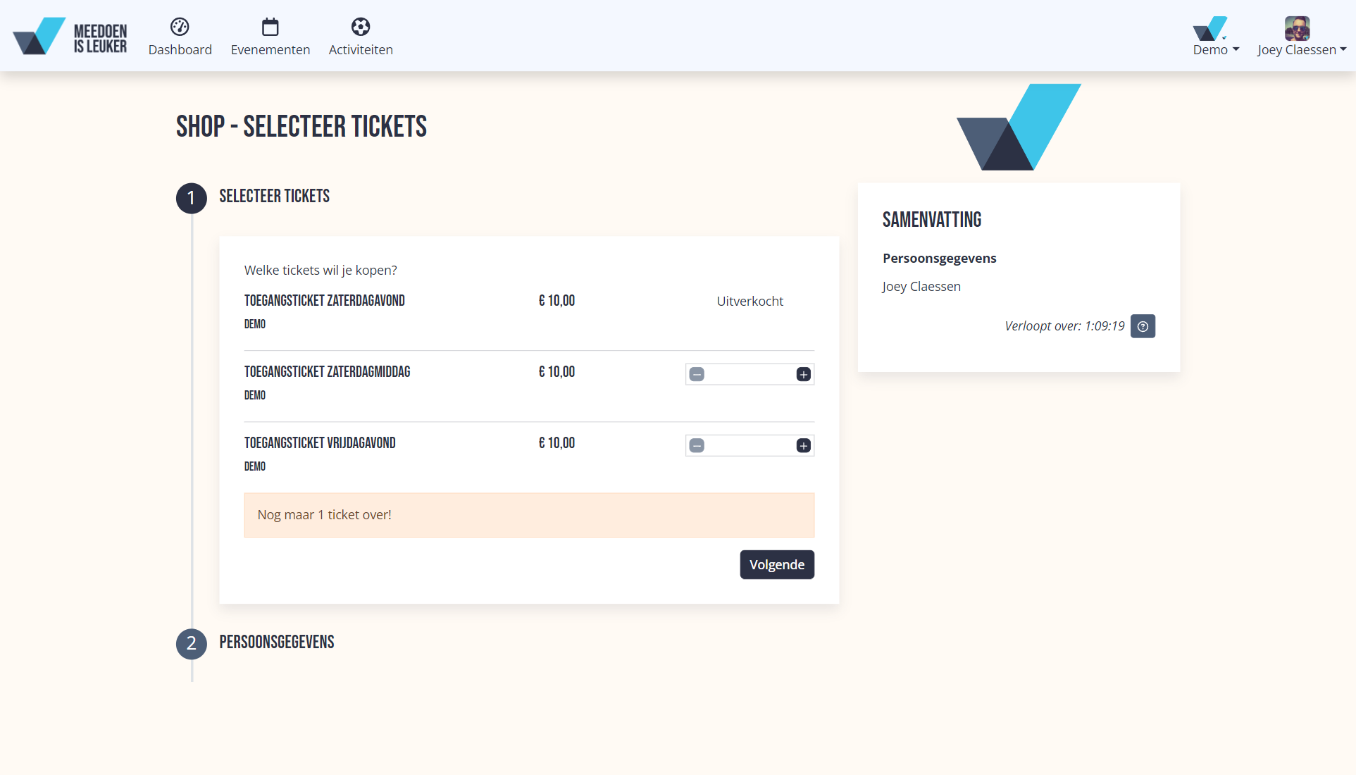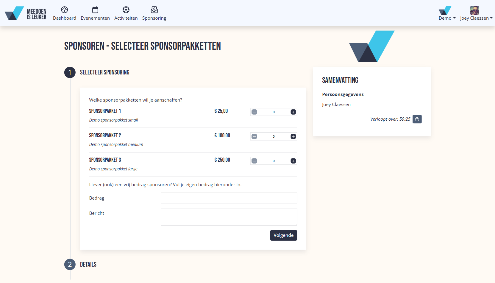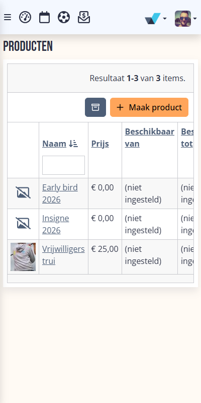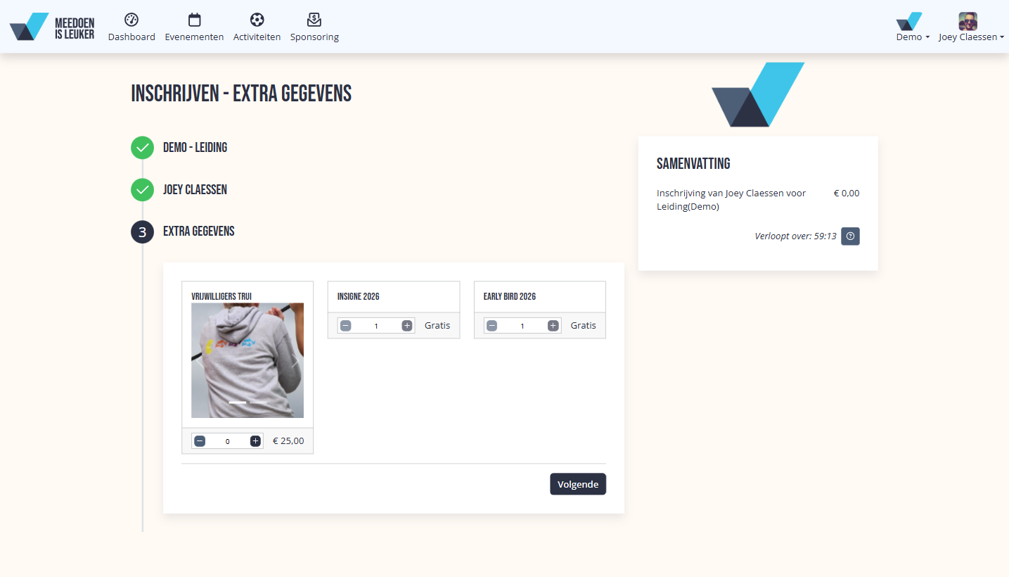 Denk bijvoorbeeld aan een shirt voor een deelnemer, trui voor een vrijwilliger of extra consumptiebonnen bij een ticket.